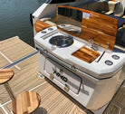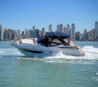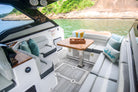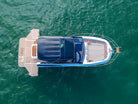 NDH 34ft is a boat that is characterized by its versatility, as it perfectly combines the benefits of an open bow motorboat with the comforts of a cabin. It has a spacious cabin and a traditional design that includes L-shaped sofas, cup holders, a command post with double seats for pilot and co-pilot. All this protected by a rigid roof, increasing comfort and safety for passengers in different weather conditions.